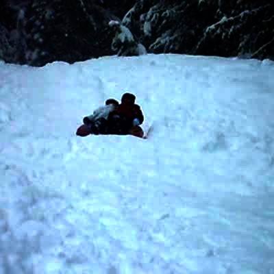 At night a boy crashes an inner tube sled on a snow covered hill. He stands up and his twin brother crashes into him with another sled. Short tails. Winter.