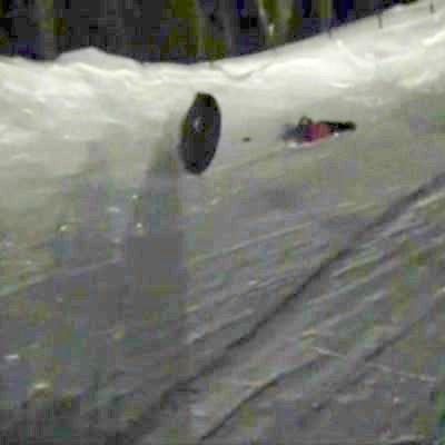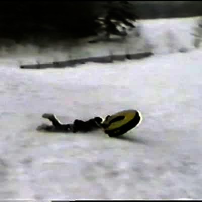 Teen boy rides inner tube down a snow hill & flies through the air. He disappears out of the frame. No recovery. Winter.