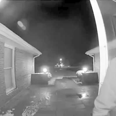 A boy slips and falls on the icy walkway to a front door in the winter snow. Security footage.