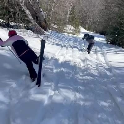 2 women struggle to ski down a hill and they both just tip over and fall into snow.