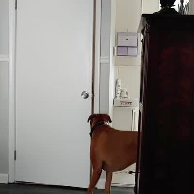 A dog walks into a pond in the backyard. A woman tries to pull her out but falls into the water instead. She steps out and the dog comes out by herself. Security Footage.
