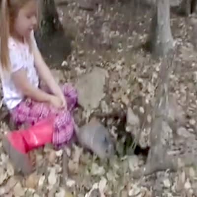 A little girl pulls an armadillo out of a hole by his tail and then doesn't want to say goodbye to him and cries.