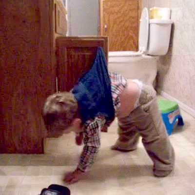 Tot boy cries in the bathroom because his shirt is stuck in the cabinet door and he's hanging there.