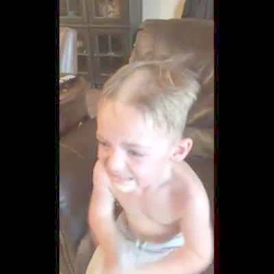 A little girl tot cries and screams to the woman behind the camera that she's 'Happy!'