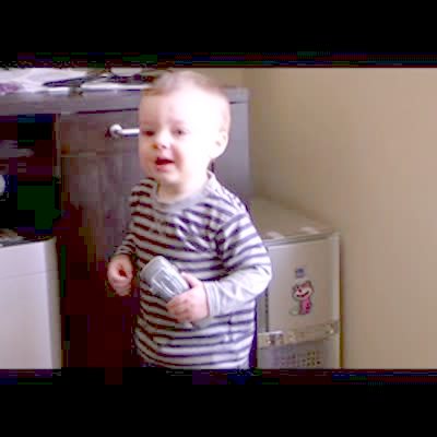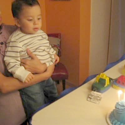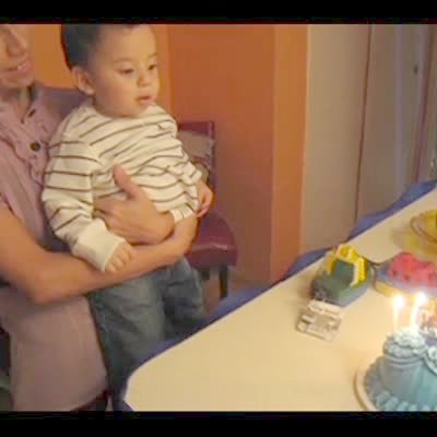 Woman holds tot boy while man sings Happy Birthday to the tune of Jingle Bells. When man sings HB the normal way, boy cries.