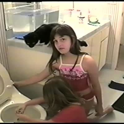 "Funeral For A Fin" 2 girls lose their goldfish, have a funeral over the toilet as the cat looks on. Younger girl cries hysterically. Stand alone.
