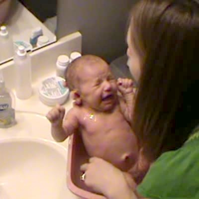 A woman gives a newborn baby girl a bath on a bathroom counter. The baby girl screams and cries. The woman blows on her face and the girl makes a surprised face and raises her arms each time she's blown on. Very cute.