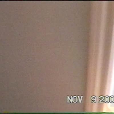 A man falls through a house's ceiling while he works in an attic and causes insulation to fall on the living room floor. Security footage.