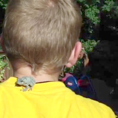 A small frog jumps from a boy's back onto a little girl's head, causing her to cry.