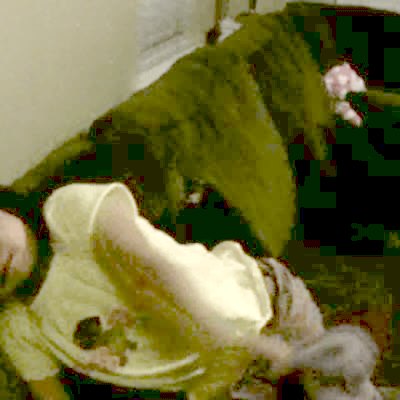 A baby girl cries in a living room. Her uncle puts a blanket over her, and she stops, but she starts again each time he moves the blanket.