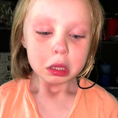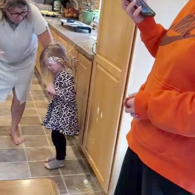 A woman helps a young girl do the whipped cream challenge in a kitchen, but the whipped cream flies up and lands on a tot girl's head, then the tot girl cries.
