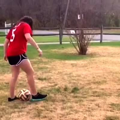 A teen girl juggles her soccer ball with her feet. She loses the ball and something breaks off camera.