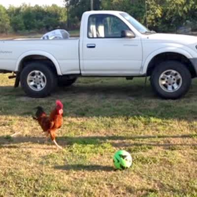 A rooster chicken runs after a soccer ball and kicks it repeatedly outdoors.