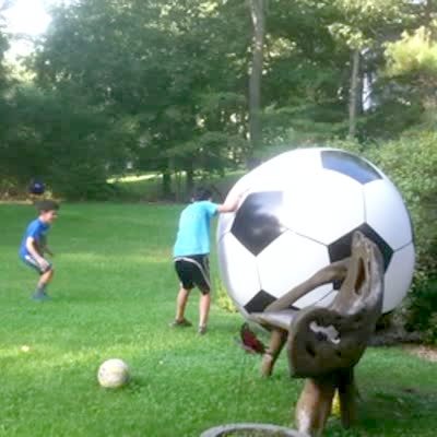 A young girl on a swing kicks a giant inflatable soccer ball into a young boy and knocks him over. Slow motion.