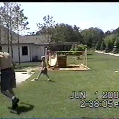 A young girl kicks a soccer ball that hits her younger sister in the face. The girl second guesses checking on her sister or stopping the camera and decides to stop the camera.