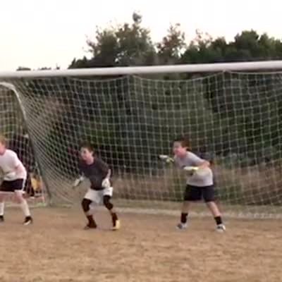A boy kicks a soccer ball at a goal on a field and the ball bounces off the pole and hits the boy who plays goalie in the head. Featured talent cleared only (the two boys playing soccer).