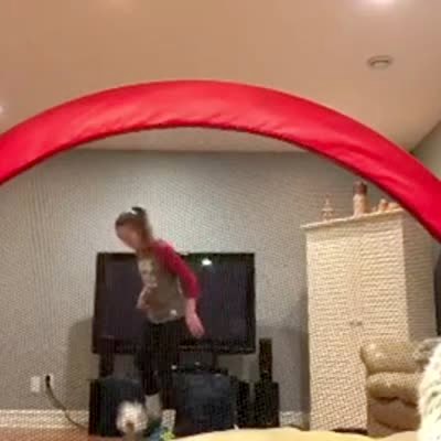 A young girl practices soccer tricks in the house and kicks the ball and breaks something with glass.