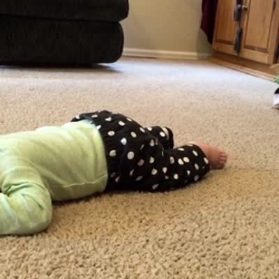 "Put A Sock In It" Baby girl stands on mom's stomach, gets her sock caught in mom's braces as mom lays on the floor. Woman laughs with sock in her mouth.