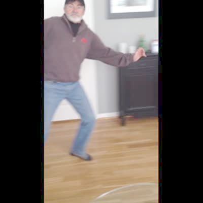 A young boy with boxing gloves pretends to do a training montage in the living room while "Eye of the Tiger" plays. He punches the bag, but slips and falls. Music rights not cleared.