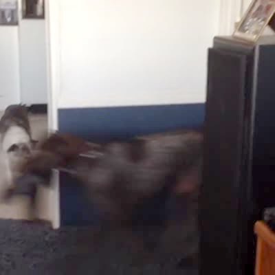 A woman falls on the living room floor when her socks slip on the hardwood floor as she runs from two dogs as she does the What the Fluff challenge.