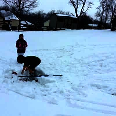 A boy wears only a T-shirt and socks as he skis down a small hill in his front yard and crashes into a snowman.