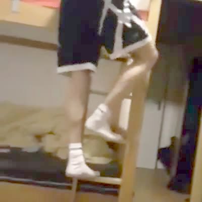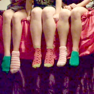 Three teen girls with colorful socks tape only their legs moving to music. They sit on a bunk bed, which breaks.