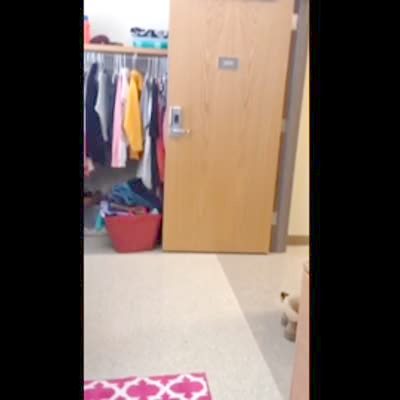 A teen girl slips and falls when she tries to slide into a room on her socks in imitation of Risky Business at home.