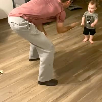 A tot boy holds a Lego toy plane in the living room and is encouraged by a man to "go show mommy." The boy runs through a hallway and slips and smashes the Lego plane across the floor.