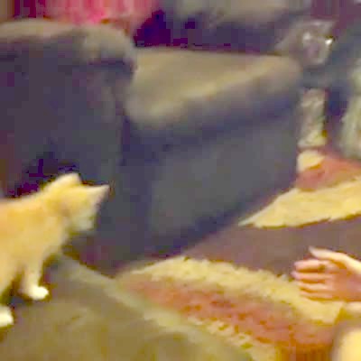 A man whistles to his dog, and she wakes up and falls off the living room couch.
