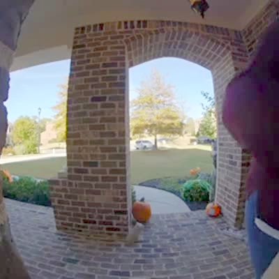 A woman carries a sofa out of a house. At around 0:45 she trips and falls and the sofa lands on top of her.