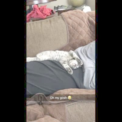 A man sleeps on a couch and a kitten cat sleeps on him.