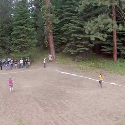 "Drone Me Out To The Ball Game" A camera on a drone films a softball game in the woods outdoors when a batter hits the ball and knocks the drone down, causing it to crash to the ground.