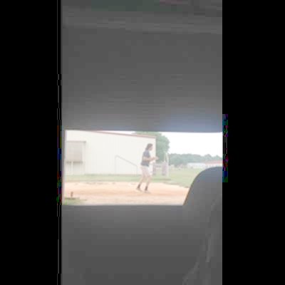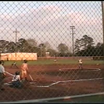 Teen girl hits softball right at man behind the camera. Looks like it hits his groin.