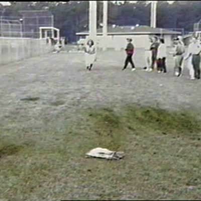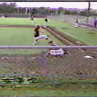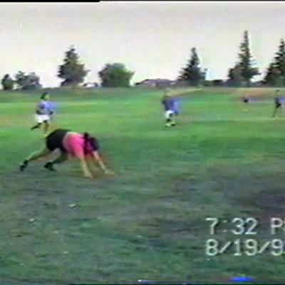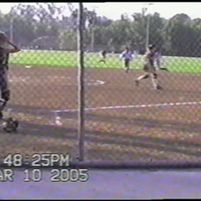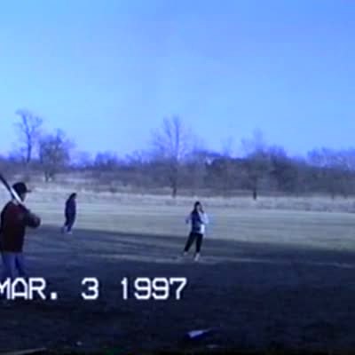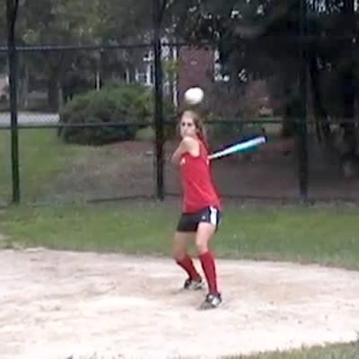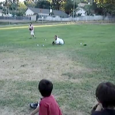 At 0:35, a girl gets hit in head with softball after her brother hits a line drive right back at her.