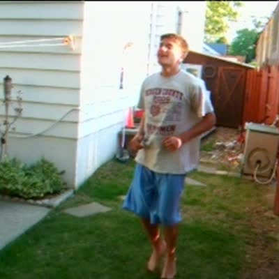 Teen boy tries to catch a giant water balloon but it pops on him. Boy gets soaking wet.
