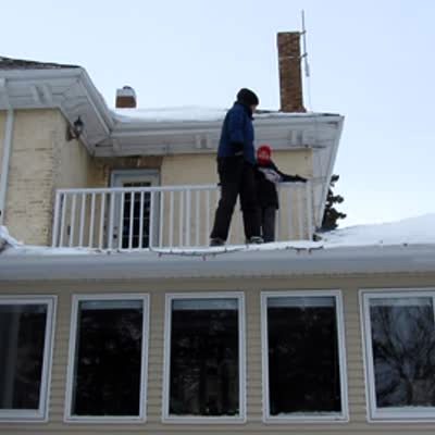 A woman jumps off the roof of her house into a large pile of snow outdoors and is hurt when it turns out the be frozen solid.