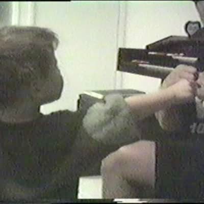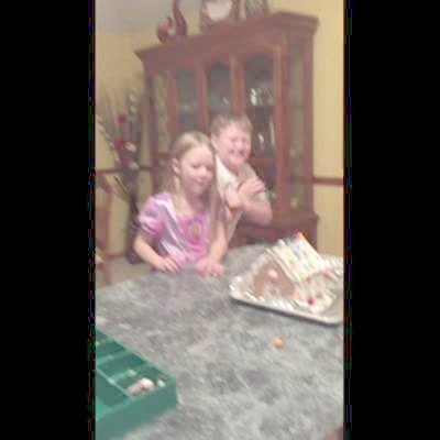 A young boy tries to destroy a gingerbread house by karate chopping it, but it is solid and hurts his hand, so he has to tear in apart in a kitchen.