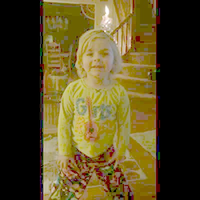 A woman asks a tot girl to sing Happy Birthday in Spanish, and the tot girl sings "Happy birthday in Spanish" in the bedroom.
