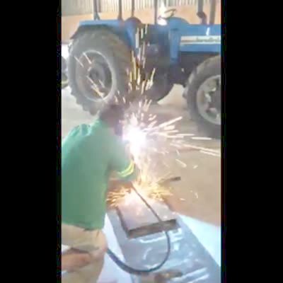 A man in his workshop welds something. The hammer in his pants hits the sheet of metal between welds, seeming on its own.