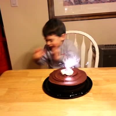 A tot boy sits indoors in front of his birthday cake while a woman lights the candle. The candle shoots sparks like a firework, scaring the boy and causing him to run out of the room.