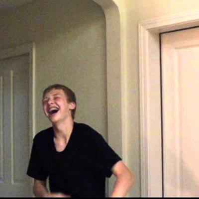 A teen boy holds a firework in his hand in a yard and screams while sparks fly everywhere. The explosion gets bigger, then he drops it and runs.