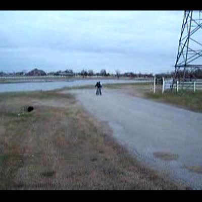 Fireworks shoot into the air, the pipe tips over & man tries to put it back upright. He tips it too far & more fireworks shoot sparks into his face. Man runs away. Bonehead. 4th of July.