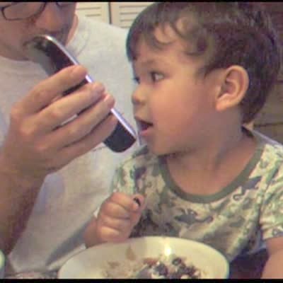 A boy tot sits on his dad's lap at a dinner table and they talk on speaker to his grandparents. The boy tot sneezes and a bean comes out of his nose and into a tissue. The family around him laughs, not realizing that he stuck it up there. Action starts at 1:51.