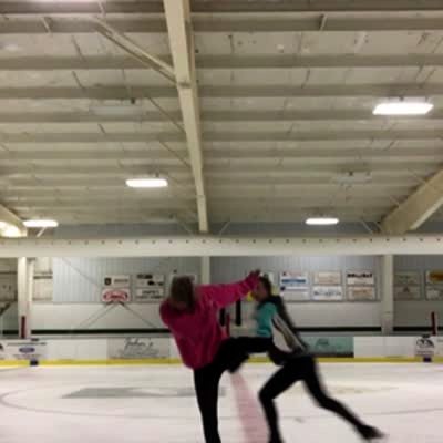 Two young teen girls ice skate in a rink and dance to a song on the speakers. They don't pay attention to where they skate and crash into each other and fall down.