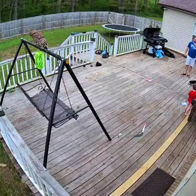A family on the back deck uses a speaker to call owls, then an owl flies towards a man and he screams. Security footage.