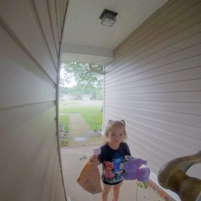 A tot girl walks up to a front porch and says, "Hey house, I'm here... hello." A man replies through a security camera, "Hello" and she screams and runs away. Home security camera.