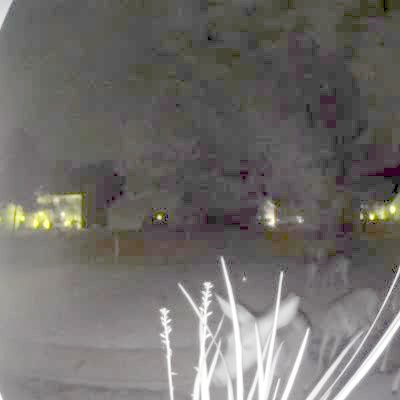 As a group of deer munch on flowers and plants in a front yard, a woman comes over her Ring camera speaker and yells, "Get out of my plants...I knew it was you..." The deer then scurry away. Security footage.