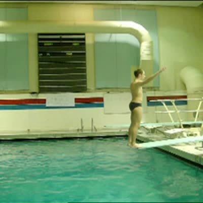 Teen boy in a Speedo practices diving, he does a backflip dive off the board and belly flops. Short clip, no tails.