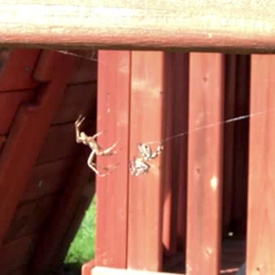 A man screams in the backyard while he films two spiders when one of them dangles from a thread as he tells his young daughter there's not to be afraid of them.