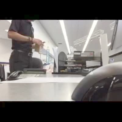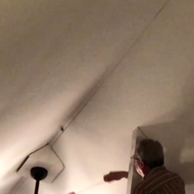 Man pranks his friend at work with a fake spider attached to fishing line. Man yells when spider comes down from ceiling while he's on his work break. Practical joke.